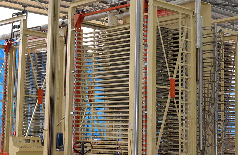6:熱壓成型處理:經(jīng)過涂膠鋪設(shè)好的模板層,通過熱壓工藝進(jìn)行壓平。傳統(tǒng)的加熱時(shí)采用了鍋爐水傳到熱進(jìn)行加熱,現(xiàn)代化設(shè)備室采用了電加熱,壓平后,可以增加建筑模板的密實(shí)度,成型比較規(guī)則,提高了模板的使用質(zhì)量。采用先預(yù)壓再熱壓的工藝,大程度降低坯板錯(cuò)位的幾率,再施以合理的壓力和溫度熱壓,保證了每一張建筑模板均有好的膠合強(qiáng)度和硬度。